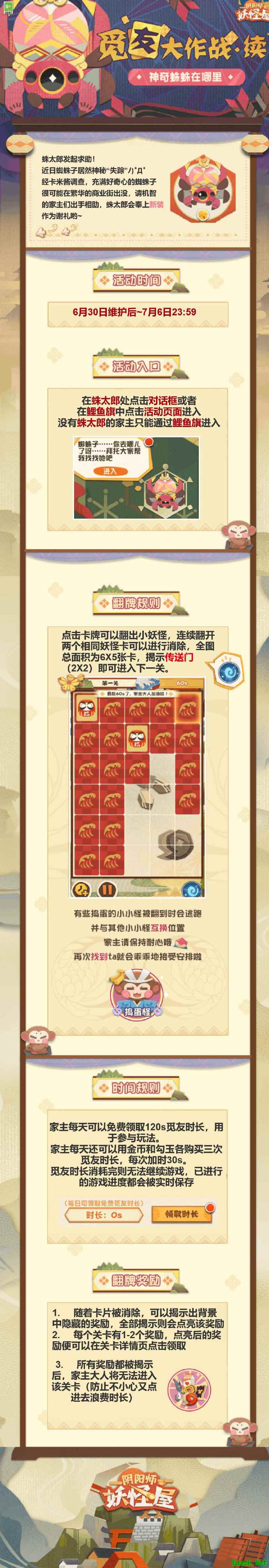 《阴阳师:妖怪屋》觅友大作战·续活动玩法攻略※温馨提示: 1. 传送门占位为:2X2卡,道具占位为:2X2卡、3X3卡、3X4卡(小鱼)、4X4卡、4X5卡(6-1皮肤)等,只需要揭示点亮对应传送门或者道具即可,不需要消除全图卡片 2. 未点亮的道具可以再次进入关卡点亮,着急获得皮肤的家主,可以优先解锁传送门,先完成6-1即可拿到皮肤,后面再返回解锁未解锁的奖励 3. 该活动有排行榜,但是无排名奖励 4. 觅友时长每天第1-3次购买花费金币,依次为:10000、15000、20000;每天第4-6次购买花费勾玉,依次为:20、30、50;每天最多可以获得总计300s,未购买的次数可以累计 5. 不花费勾玉买次数一般也可以通关 6. 觅友时长建议用完一次再买下一次,这样当时长用尽时会自动暂停,可以进行休整和观察 7. 翻卡时建议斜着翻,更容易观察到道具和传送门的位置 8. 5-1关卡比较特殊,全部为捣蛋鬼,需要先翻一对卡(a、b)后,再去点击移动后的a,和任意一张c,即可消除;切勿一直翻新卡,会永无止境 9. 有的关卡在开始时会出现全部翻开的福利,玩家可以有3s时间观察记忆