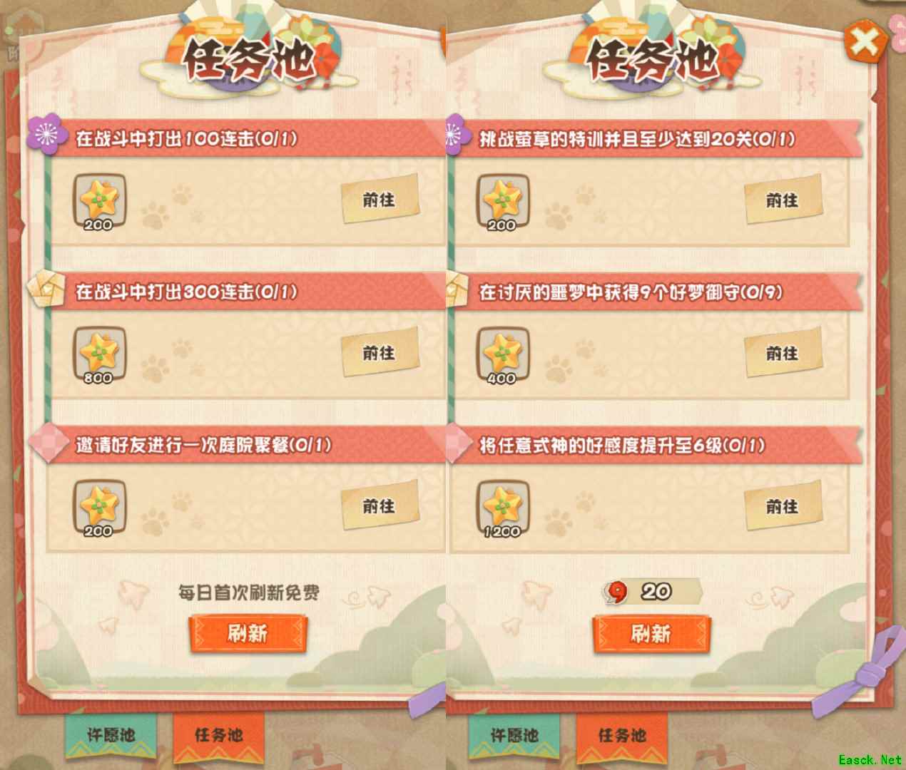 11.点击任务池可以查看任务完成情况; 对任务不满意或者已经全部做完后需要手动按下刷新按钮刷新出3个新任务继续完成; 任务第二天不会自动刷新;不论旧任务完成几个都会刷新出3个新任务;有未完成的任务时,刷新会有二次确认提示;每日可以刷新多次、首次刷新免费;第二次开始需花费勾玉、花费随刷新次数提升,经测试第二次刷新开始依次花费勾玉:20、40、40、60、60......部分任务展示如下: