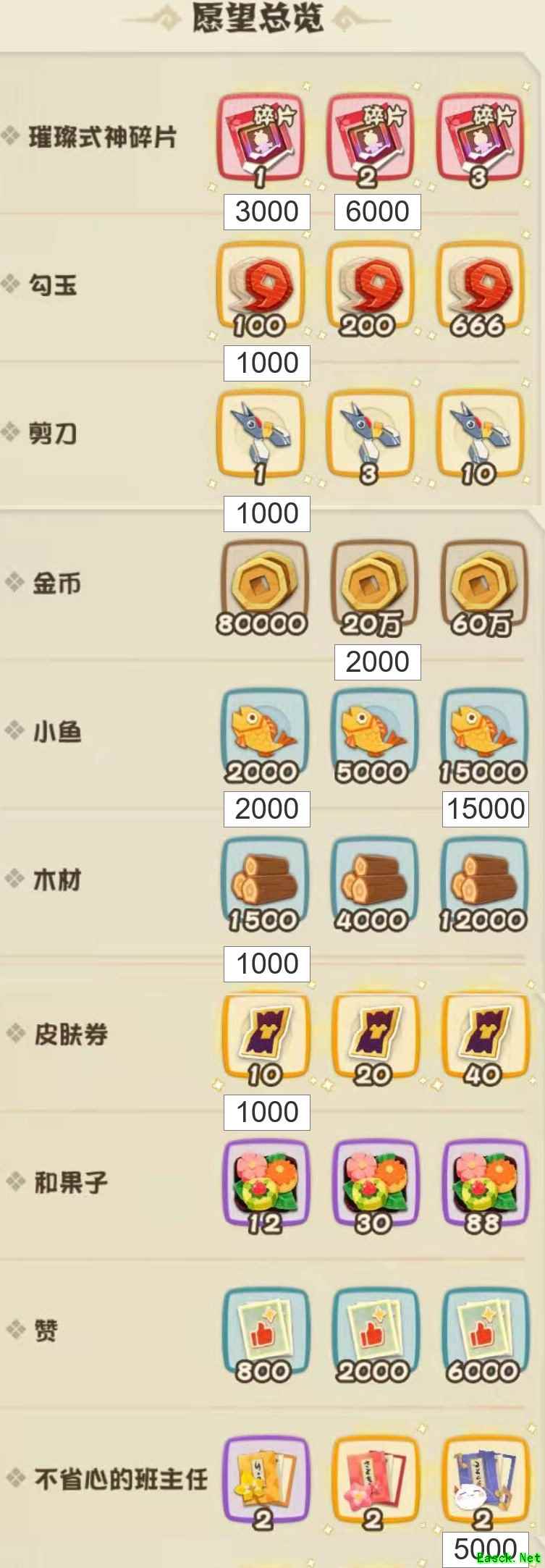4. 每天可以给自己的「祈愿伞-秋」最多祝福3次,每次祝福间隔1小时,冷却时右上角会有倒计时提示。 5.每天最多可以给其他10个不同家主的「祈愿伞-秋」分别祝福1次。 6.每天最多能被其他不同的家主祝福5次。 7.愿望选择:玩家可以从系统随机给出的愿望总览池中的三个不同类目的愿望中选择一个,如果不满意可以消耗勾玉进行刷新,选定后则不可更改;每个愿望的选择相互独立,可以重复,家主们可以根据自己的需求进行适当刷新和选择;愿望总览池见下图: