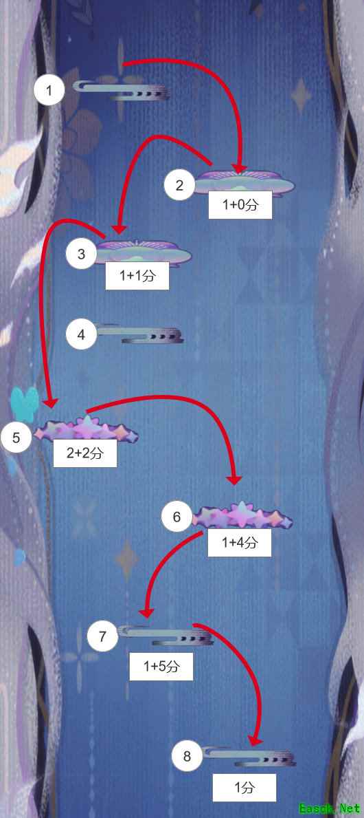 《阴阳师:妖怪屋》坠梦时光活动高分玩法技巧在坠梦时光活动中,家主大人每下一层就能获得1分,但是你知道吗?如果你一直掉落在星星平台或蹦蹦云上,你的分数就会飞速增长。 为了方便描述,我们将普通平台/尖刺平台/滚动平台统称为「普通平台」。 将星星平台和蹦蹦云称为「特殊平台」。 当家主大人连续掉落在特殊平台上就能获得额外得分,举个例子。 家主大人第一次掉落在特殊平台时获得1分,第二次掉落在特殊平台获得1+1=2分,第三次掉落在特殊平台就能获得1+2=3分,如果家主大人刻意跳过普通平台,只掉落在特殊平台上面,家主大人获取分数的速度就会越来越快。 具体操作介绍: 第一次跳跃:家主从①号平台起跳,随后跳到②号平台上,因为家主是从普通平台跳到特殊平台上面,因此没有额外得分。家主只获得了1分。 第二次跳跃:家主从②号平台起跳,随后跳到③号平台上,家主从特殊平台跳到特殊平台上,家主获得了1分的基础得分和1分的额外得分。因此家主获得了2分。 第三次跳跃:家主从③号平台起跳,越过了④号平台,直接跳到⑤号平台上,家主越过了一个平台且降落在特殊平台上面,家主获得了2分的基础得分和2分的额外得分。 第四次跳跃:家主从⑤号平台起跳,随后跳到⑥号平台上,家主获得了1分的基础得分和4分的额外得分。 第五次跳跃:家主从⑥号平台起跳,随后跳到⑦号平台上,因为家主是从特殊平台起跳,因此本次依旧有额外得分。家主获得了1分的基础得分和5分的额外得分,随后额外得分清零。 第六次跳跃:家主从⑦号平台起跳,随后跳到⑧号平台上,家住大人从普通平台跳到普通平台,因此只获得1分的基础得分。 备注:①在跳跃的途中不能触碰到最上面的尖刺,否则额外得分清零。 ②必须要等星星平台消失后再前往下一个平台,否则额外得分清零。