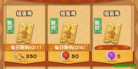 活动玩法: 家主每次扭蛋将消耗一张「扭蛋券」,然后可获得随机颜色扭蛋与一枚「扭蛋币」。 本次活动共持续12天,在不使用魂玉的情况下,家主每天可以在杂货店内购买5张「扭蛋券」。十二天共可获得60张扭蛋券,需要花费4200小鱼干和2400勾玉。