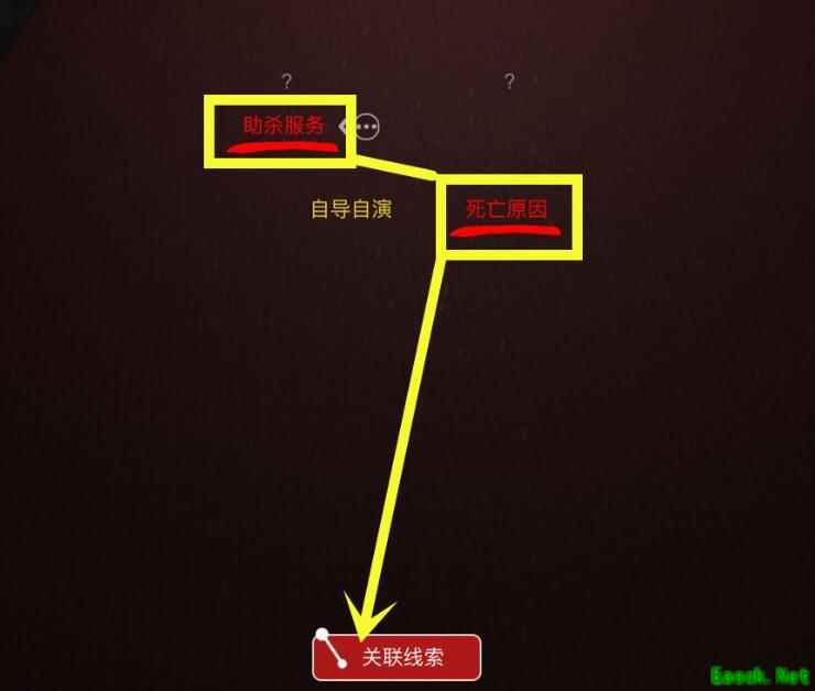 《孙美琪疑案-袁家宾馆》2级线索——自导自演自导自演:这是一个不能直接获得的线索,需要关联4个其他线索获得,分别是: 五级线索:【陈子骞】 四级线索:【日记本】 二级线索:【死亡原因】、【助杀服务】
