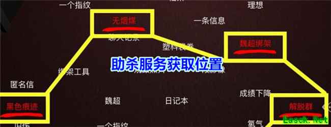 《孙美琪疑案-袁家宾馆》2级线索——助杀服务助杀服务:这是一个不能直接获得的线索,需要关联五个其他线索获得,分别是: 三级线索:【魏超身份】、 四级线索:【魏超绑架】、【黑色痕迹】、【无烟煤】、【解脱群】