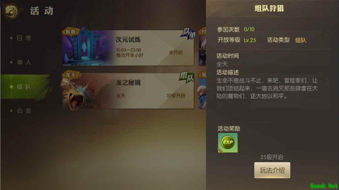 四、组队狩猎 在活动中点击“组队狩猎”,组队完成狩猎任务,就能获得大量经验奖励。