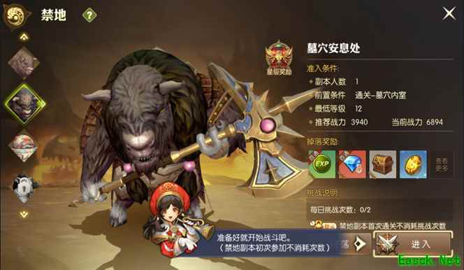 五、禁地副本 1、点击游戏界面右上角“副本”图标,点击“禁地”,我们要根据自身战斗力等级情况选择合适的副本地图。 2、在通过副本后即可获得经验(10w左右)和装备。 3、每张副本地图只能一个人参加,而且每天只能挑战两次。