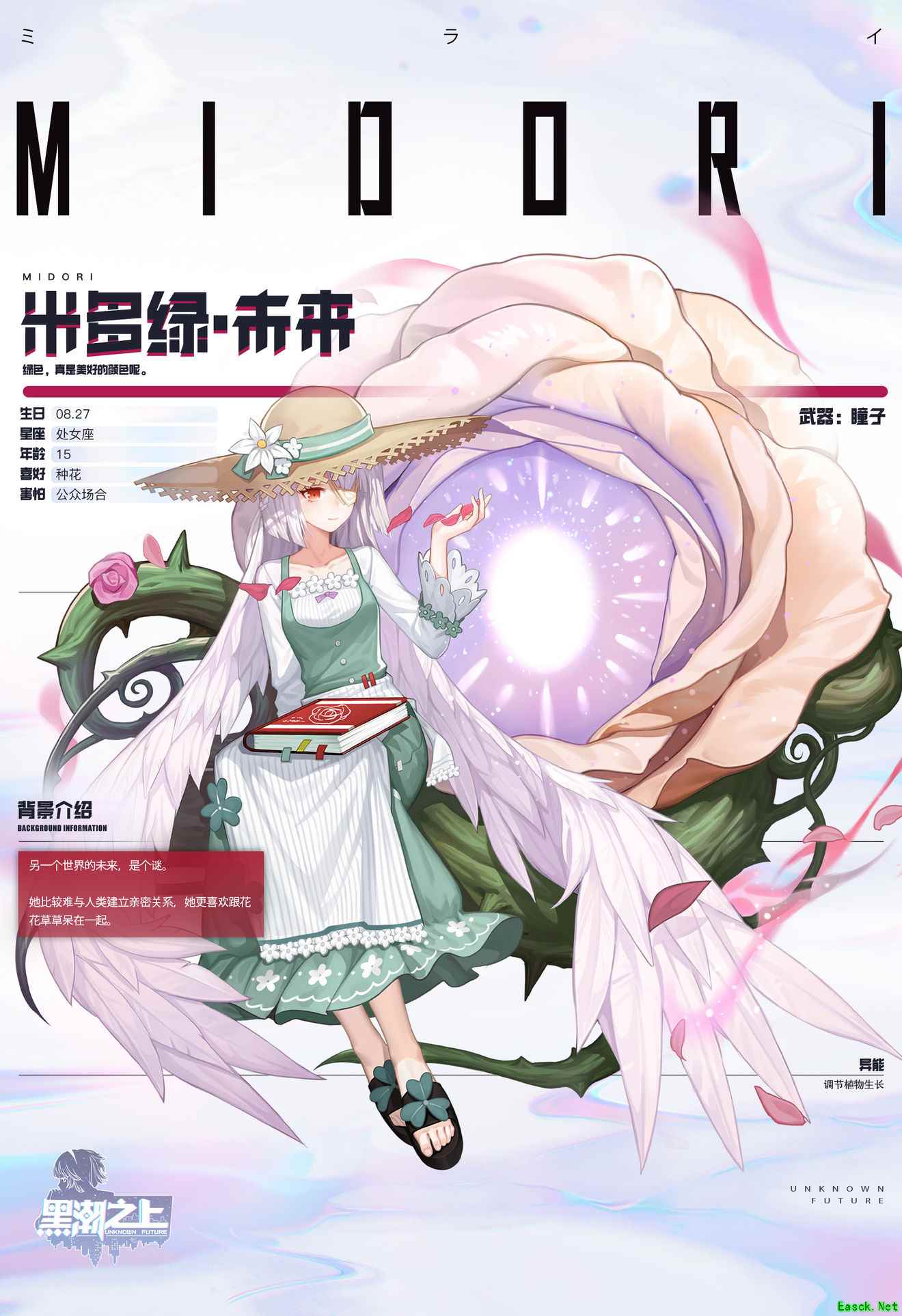 米多绿未来角色介绍:一、基本信息 姓名:米多绿·未来 MIDORI·MIRAI 生日:08月27日 星座:处女座 年龄:15 喜好:种花 害怕:公众场合 异能:调节植物生长 武器:瞳子 二、背景故事 另一个世界的未来,是个谜。 她比较难与人类建立亲密关系,她更喜欢跟花花草草呆在一起。 三、原画欣赏