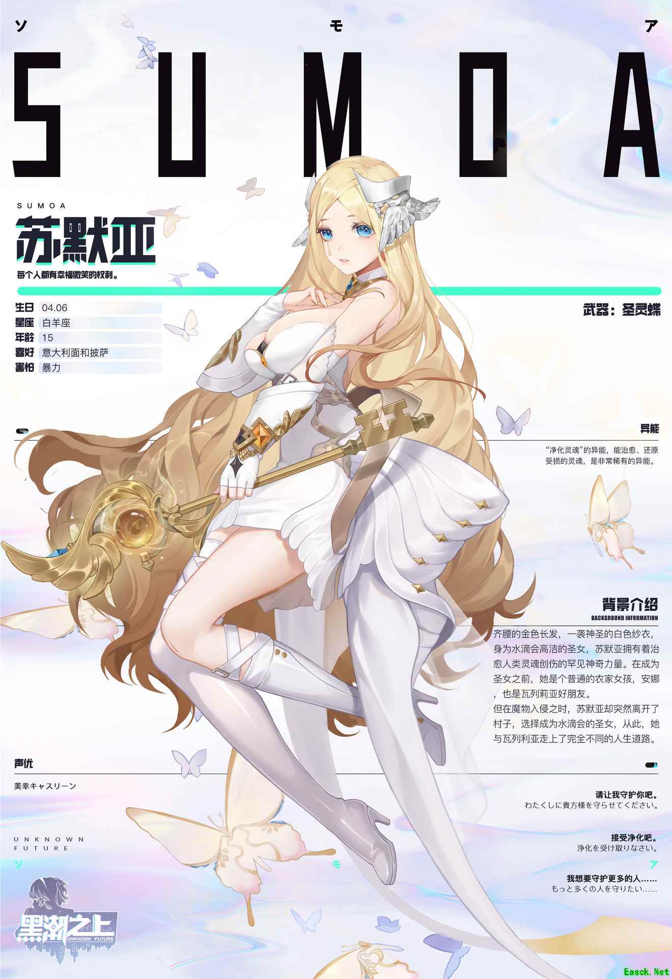 《黑潮之上》苏默亚角色介绍一、基本信息 每个人都有幸福微笑的权利。 姓名:苏默亚-Sumoa 生日:04月06日 星座:白羊座 年龄:15 喜好:意大利面和披萨 害怕:暴力 异能:净化灵魂 武器:圣灵蝶 二、背景故事 齐腰的金色长发,一袭神圣的白色纱衣,身为水滴会高洁的圣女,苏默亚拥有着治愈人类灵魂创伤的罕见神奇力量。在成为圣女之前,她是个普通的农家女孩,安娜,也是瓦列莉亚好朋友。 但在魔物入侵之时,苏默亚却突然离开了村子,选择成为水滴会的圣女,从此,她与瓦列利亚走上了完全不同的人生道路。 三、原画欣赏