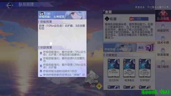 核心卡牌: 纯净轰击:造成165%的法术攻击伤害,若有精神增益,会造成2次伤害,百分比较高,同时只要有觉醒状态就能打2次,非常实用的输出手段。 宁静咏唱:获得(6%总生命)护盾,1点觉醒状态,获取觉醒状态点数的主要来源,1点能量值更加灵活。 终极技能:获得10%总生命护盾,3点觉醒状态。 评测: 大招比较特殊,是属于对自己的增益效果,高额的护盾可以抵挡敌人的高攻击,觉醒状态可以用于下回合反攻,比较适合攻克高难本。 总结: 未来是一个防守与攻击兼备的角色,但是前期发力较慢,需要攒觉醒点,适合高难副本开荒使用。