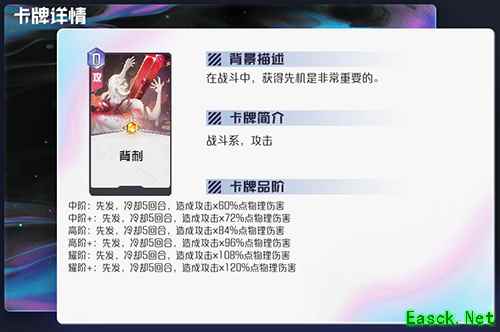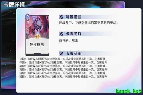 诺配卡:1【背刺】,2【弱点斩击】,1【狂化斩击】。1【弱点斩击】可以1【亢奋】或1【背刺】代替。 辅助配卡:根据敌人类型放盾或者治疗类的辅助卡,有需要可以带【授君以花】,增加诺的湮灭卡牌数量,在短局比较有效,在长局长远来看属于一张废牌。