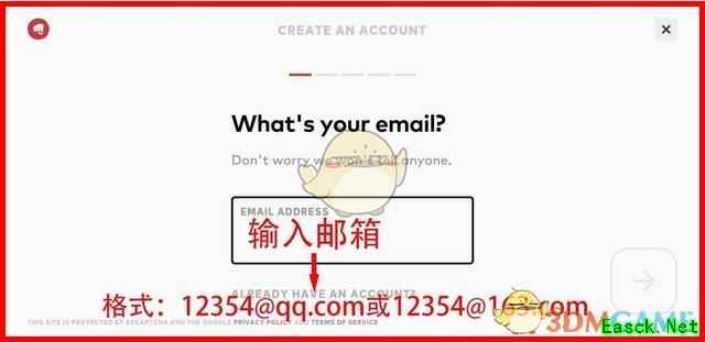 2、填写你要注册的邮箱,任意邮箱即可,只要能收到邮件就行,例如网易邮箱12345@163.com或谷歌12345@gmail.com或QQ邮箱123456@qq.com。(这里推荐使用QQ邮箱,如: 12345@qq.com)