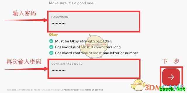 如果注册完在这用户名下面提示"usernameXX"的紫色提醒,就是用户名被占用了,换个用户名就好了。 5、然后创建你登陆游戏的密码, 需要输入两次(建议使用英文和数字结合,更容易被系统认可), 游戏登陆密码,一定要记得!