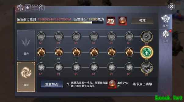 军衔战技: 军衔战技第一排技能可增加命中、真实攻击、格挡,这些属性对输出能力增益并不高;第二排提升全属性强化、爆伤强度,而且节点技能也可增加暴击,性价比较高,因此优先点满第二排;第三排技能主要双防解除、重击和闪避,有一定的效果,建议在升级第二排获得关键节点技能后,可适当升级第三排。