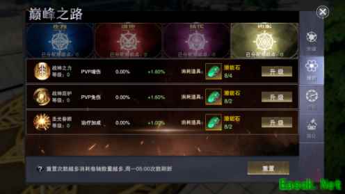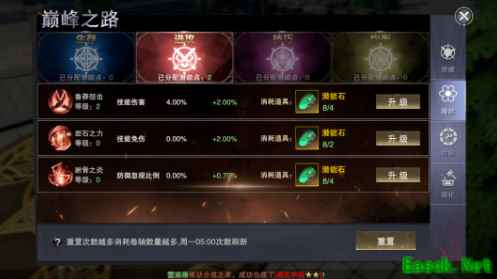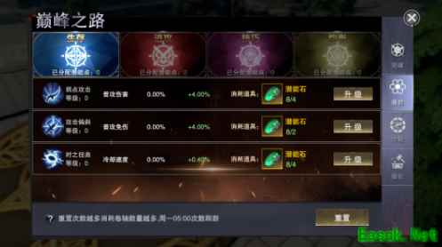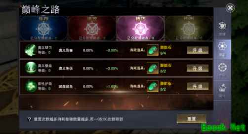 三、巅峰潜能 巅峰潜能分为生存、进攻、技巧和均衡4个板块,玩家可根据职业特效进行升级。生存天赋主要对普攻伤害、普攻免伤和冷却缩减等进行百分比加强,进攻天赋则侧重技能伤害,可提高技能的百分比伤害以及技能免伤,技巧天赋提升奥义伤害、奥义减伤和减益减免,均衡天赋则是提高PVP增伤、PVP免伤和治疗加成。