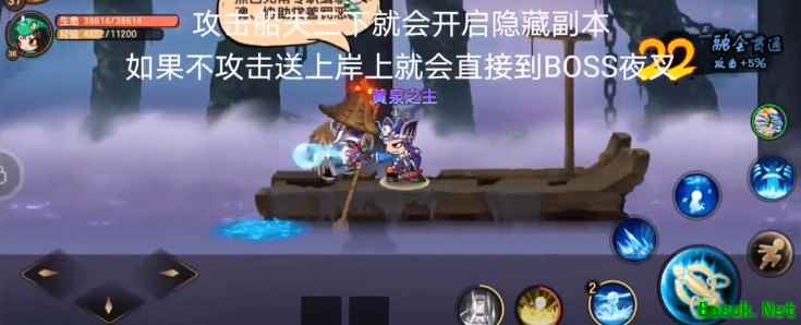 掉到船上后,攻击船夫三下就会触发隐藏副本了。如果不攻击被送上岸的话就是直接到本关boss夜叉。