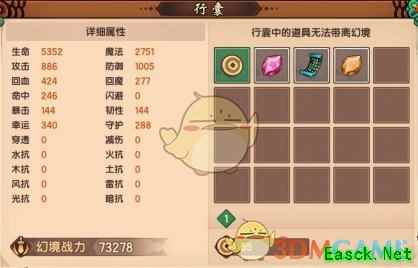 行囊也会显示上仙们在幻境中拥有的独立的角色属性,通过获取晶石等道具会临时提升上仙们的属性。