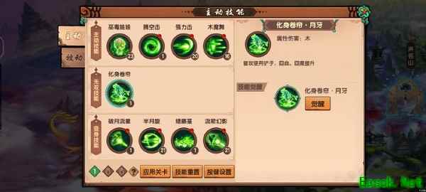 娃娃带毒花,增强真身恢复能力。 强力击可以不觉醒。 木魔舞选择连射,具有很好的远程攻击。 无双我个人要月牙,因为无双弓箭攻击容易使boos脱控,用铲会稳一些。同时提升回血回魔,正好增强沙僧身板。 被动211,因为残叶与危叶绑定三技能觉醒,不考虑使用。 带上鬼弓,普攻会有滞空效果,十分推荐。 2、丹元选择: