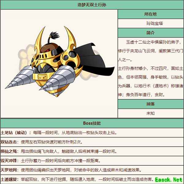 《造梦无双》土行孙技能介绍1.土龙钻(被动):每隔一段时间,从地底钻出一枚钻头攻击上仙。 2.双钻连击:使用左右双钻快速对前方针刺2次。 3.捆仙之绳:甩出捆仙绳飞向敌人,触碰敌人后将其束缚一段时间。 4.毁灭冲锋:土行孙蓄力一段时间后向前方冲撞一段距离。 5.天罗地网:使用捆仙绳编织出天罗地网,对被命中的敌人造成麻木和减速效果。 6.土遁螺旋:举起双钻,向下进行挖掘,随后遁入地底,一段时间后破土而出造成伤害。