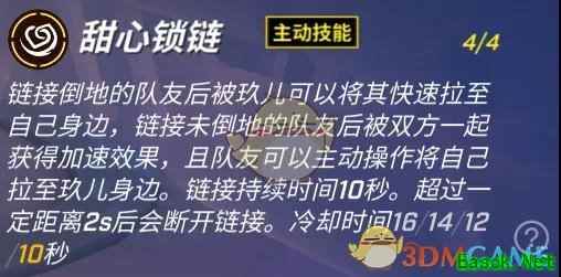 主动技能 甜心锁链 链接已经倒地的队友,可以将其直接拉到身边;链接未倒地的队友,队友可以主动将自己拉到小狐狸身边。