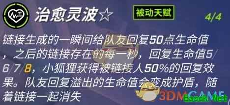 被动天赋 治愈灵波☆ 链接生成的一瞬间给队友一定生命值,此后链接的每一秒,回复一定生命值,同时小狐狸可以获得被链接人一半的治疗效果。 队友回复溢出的生命值会变成护盾,护盾的效果随着链接一起消失。