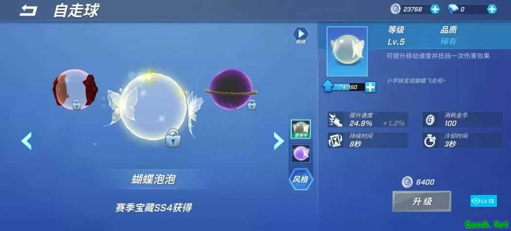《逃跑吧少年》自走球道具卡介绍品质:稀有冷却时间:3秒提升速度:20%(随着升级速度会提升)持续时间:8秒 消耗金币:100介绍:达到白银段位后该道具卡即可在道具卡中解锁!当我们使用自走球时,可以将自身置于自走球内,并且自走球可以给我们抵挡一次伤害。效果持续8秒,升级增加移动速度。