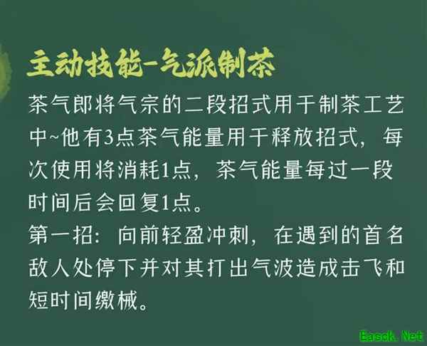 《逃跑吧少年》茶气郎技能一览答:技能是使用气宗的内功进行使用。 逃跑吧少年茶气郎技能简介 主动技能-气派制茶