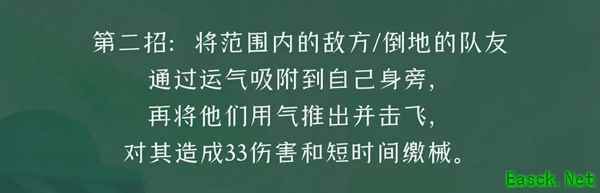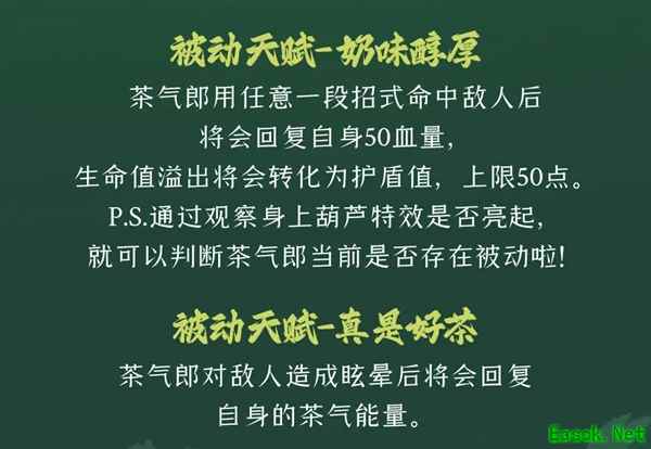 第二招:将范围内的敌方/倒地的队友通过运气吸附到自己身旁,再将他们用气推出并击飞,对其造成33伤害和短时间缴械。 被动天赋-奶味醇厚 茶气郎用任意一段招式命中敌人后将会回复自身50血量,生命值溢出将会转化为护盾值,上限50点。 P.S.通过观察身上葫芦特效是否亮起,就可以判断茶气郎当前是否存在被动啦!