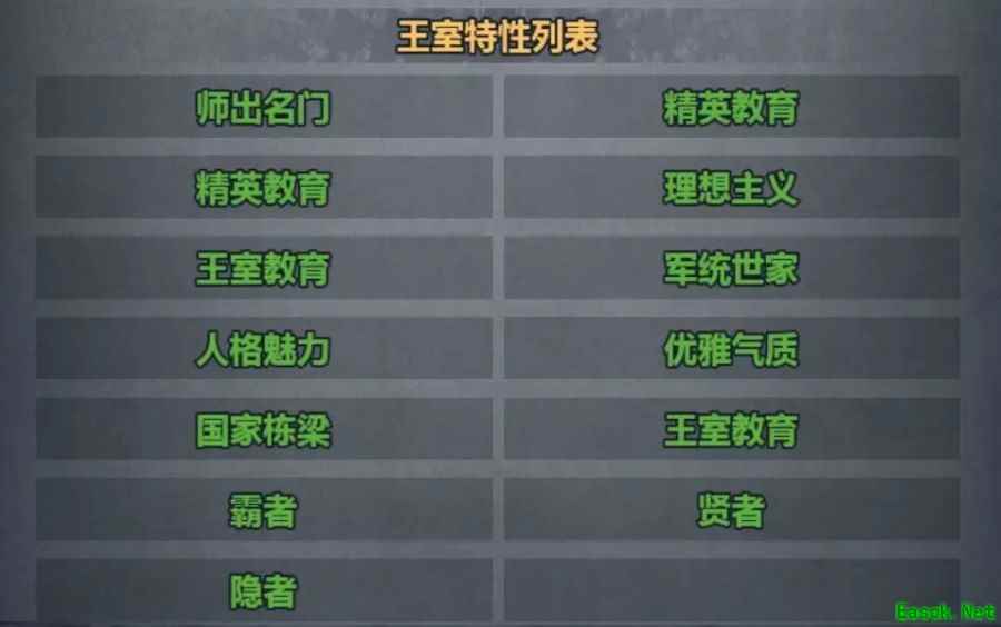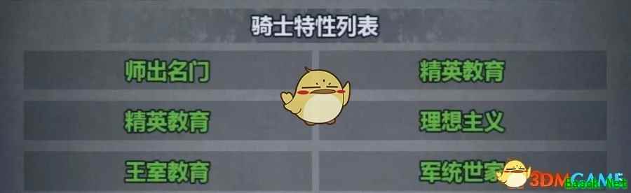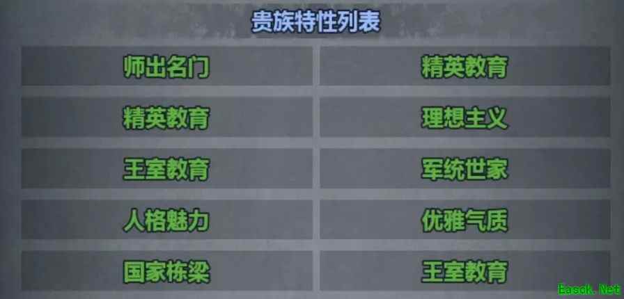 (第二行第一个精英教育为贵族教育) 1、师出名门 技巧+7,爆击+7% 评价:单项属性+7,技巧是非常实用的属性,比如轻骑等等,还是很不错的。 评分指数:3星 2、精英教育 经验获取+40% 评价:虽然说不错,但在这些重点培养里还是比较弱的特性了。 评分指数:1星 3、贵族教育 经验获取+50% 评价:比起精英教育强了不少,有明显的效果增幅了 评分指数:3星 4、王室教育 经验获取+60% 评价:经验加成收益最高的技能,TOP级别的技能 评分指数:5星 5、理想主义 较易吸引地位较高的异性,对异性表白成功率显著提升 评价:用处不大,只加异性表白成功率的特性,而且地位比较高的异性似乎目前遇不到是个bug 评分指数:1星 6、军统世家 力量+5,体质+7,感知-5,意志+5,攻击力+3 评价:感知对于这个游戏目前不算很实在的技能,无所谓,但是7体,3力,3攻真的是赚到了,骑士培育能学到的最好特性 评分指数:5星 二,贵族特性