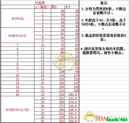 酒馆价格表与招募标准心得先结论:(八成是极品) 1级以上80块以上的 10级以上189以上的 20级以上400块以上的 思路 1、女性为男性标准价的8折 2、40年纪以上打8折,50年纪以上打6折 3、招募价格一般是其标准价的3倍,有大几率出极品,大概在八成左右。 4、老年人需要把折扣还原,除以老年系数再计算。 5、反正看到3倍价格的招就行了。