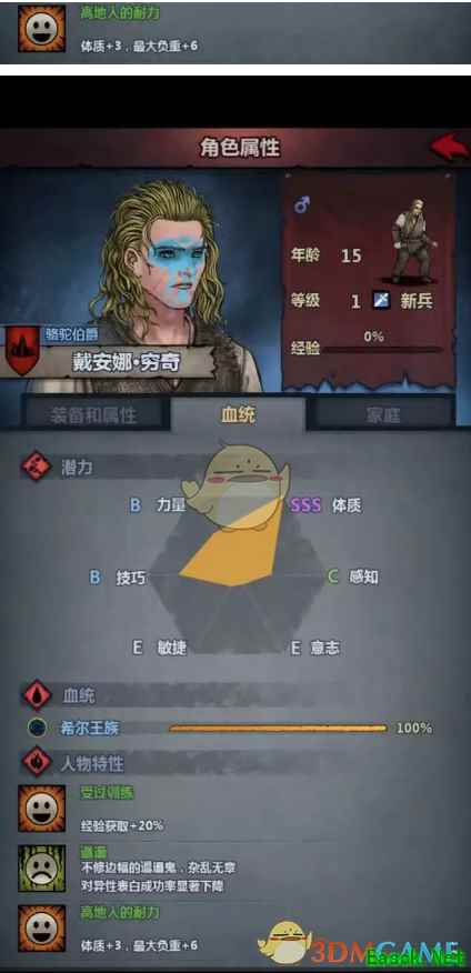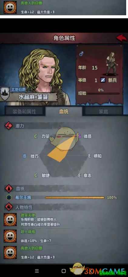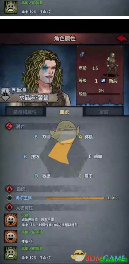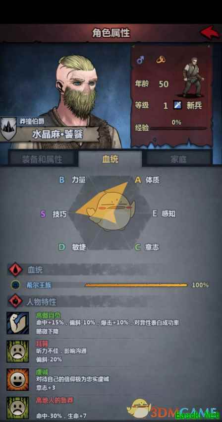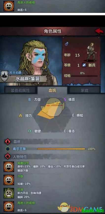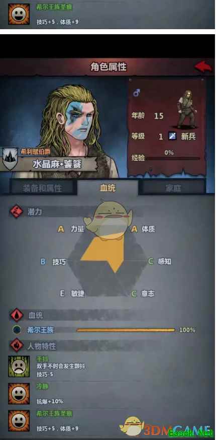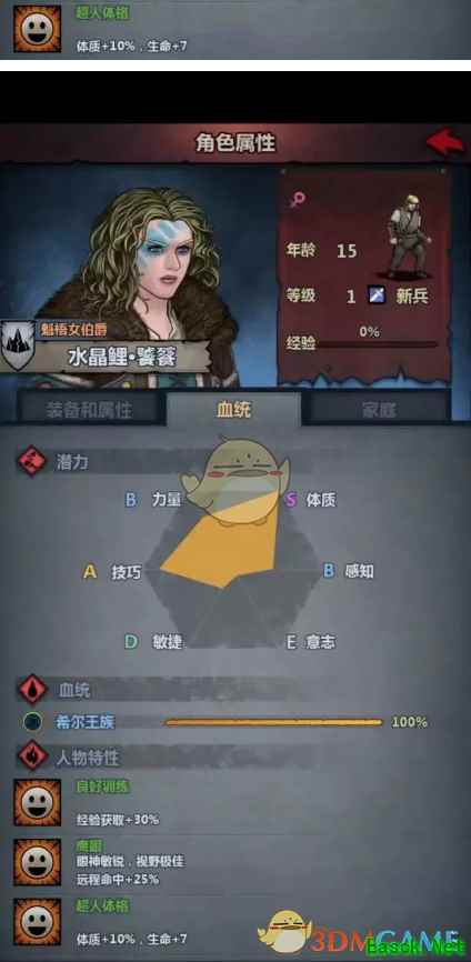 希尔王族特征及对应特性效果攻略前言: 每个国家都有两个橙色特性(圣痕和普通橙色),三个蓝色特性(高级蓝和两个普通蓝色)和一个负面buff特性,分别对应着几个外观特征,你可以理解,只要了解有血统对的上,外观没错,那么对应的特性一定有,反之亦然。 对应特性所增加的寿命 圣痕(橙):约25年 普通橙色特性:约15年 高级蓝色特性:略低于普通橙(约10年) 普通蓝色特性:5-10年 种族负面特性:无寿命增加 塞宁王族 赫雷斯特王国缔造者的后裔,其血统最早可追溯至守护神瓦提肯,身材比较魁梧,金发的白种人,高爵位的可能会有蓝色面纹,希尔血统是加体质。 圣痕 外貌特征:男性脸上有胎记,女性衣服上有印记(如图)