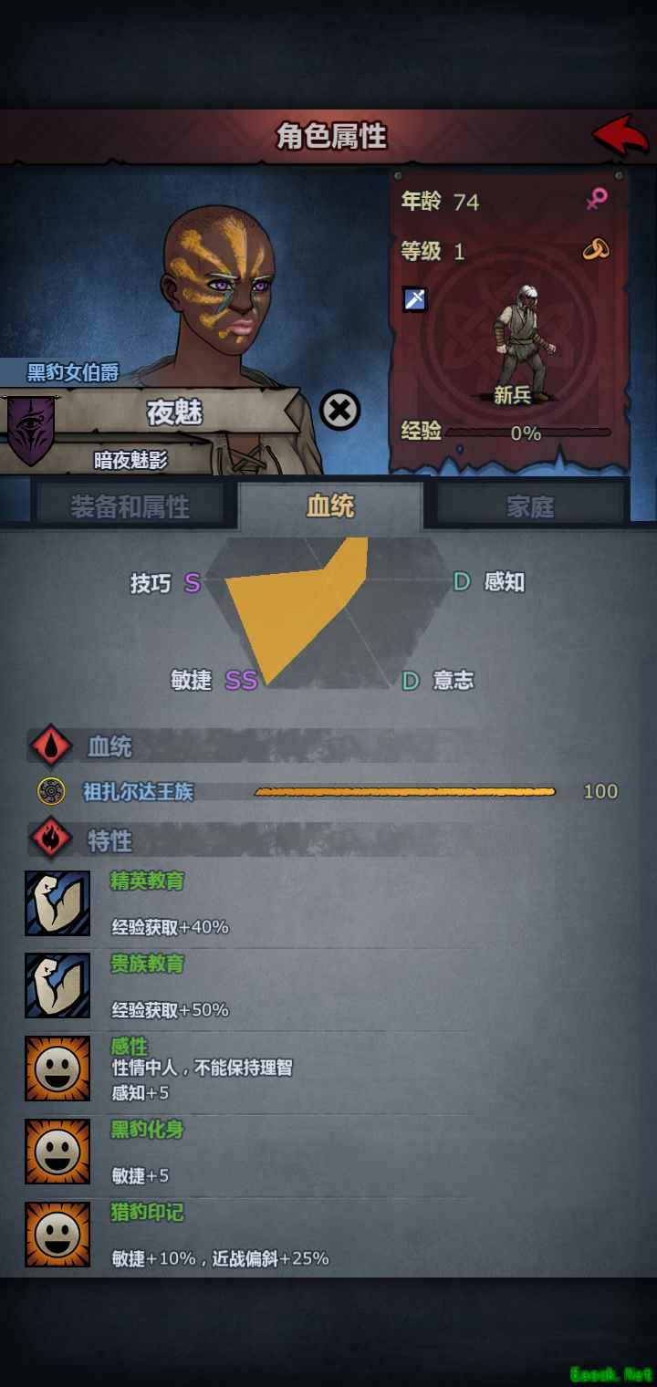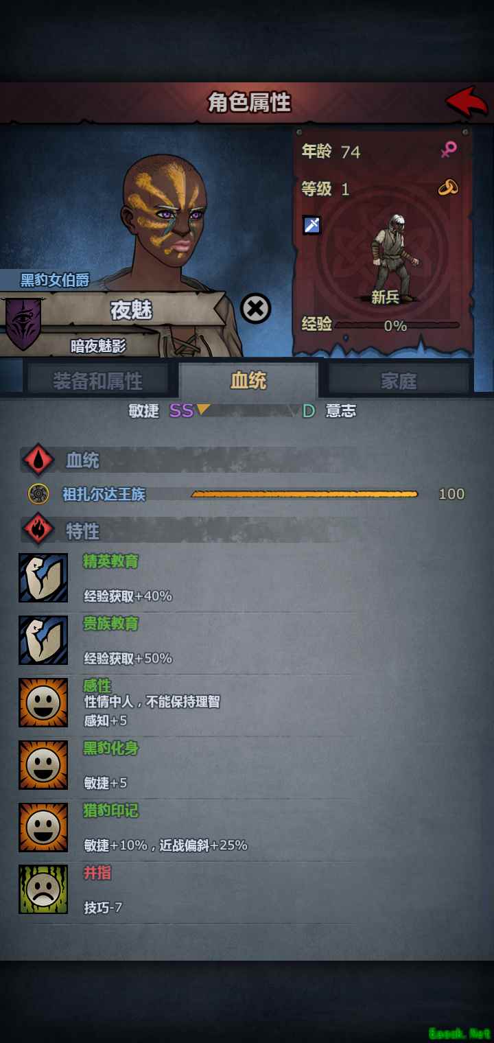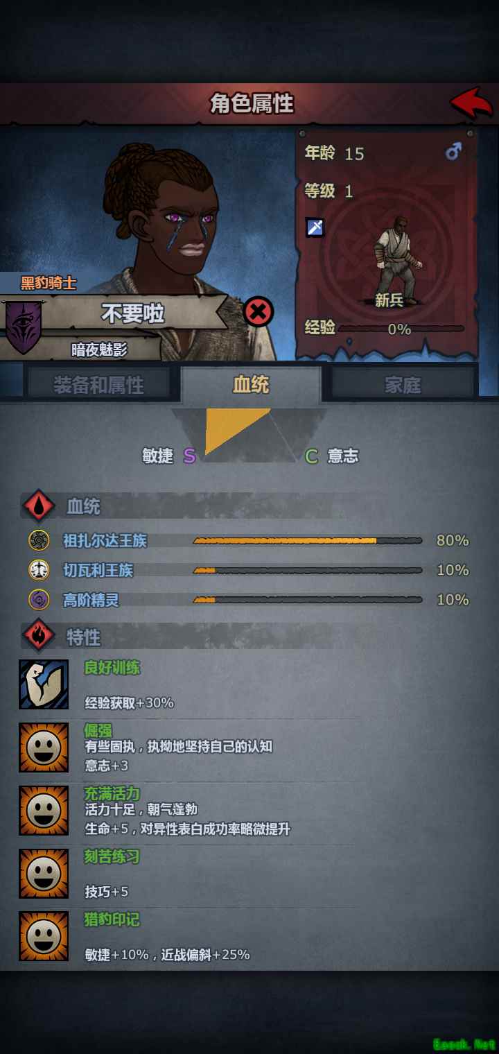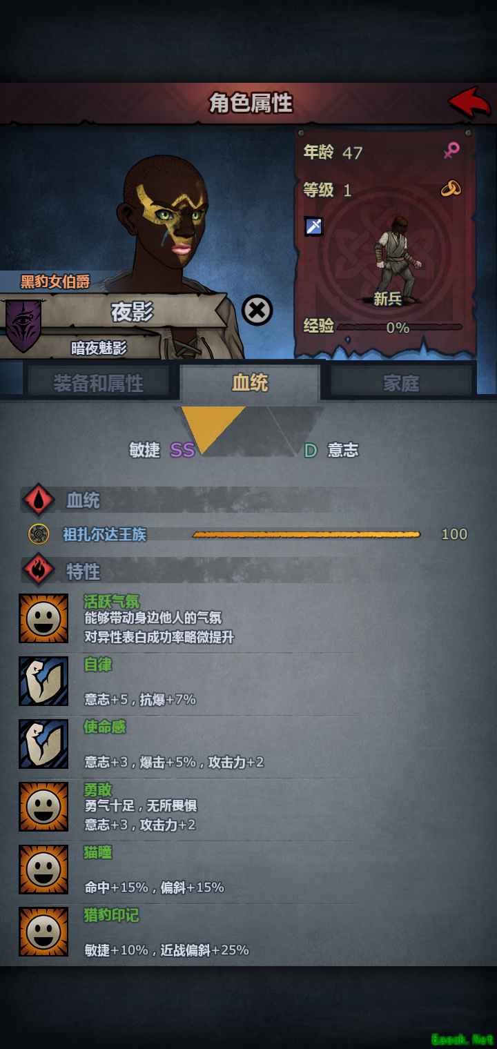 祖扎尔达王族特征及对应特性效果攻略前言: 每个国家都有两个橙色特性(圣痕和普通橙色),三个蓝色特性(高级蓝和两个普通蓝色)和一个负面buff特性,分别对应着几个外观特征,你可以理解,只要了解有血统对的上,外观没错,那么对应的特性一定有,反之亦然。 对应特性所增加的寿命 圣痕(橙):约25年 普通橙色特性:约15年 高级蓝色特性:略低于普通橙(约10年) 普通蓝色特性:5-10年 种族负面特性:无寿命增加 祖扎尔达王族 黑人皮肤黑不容易看面相,很容易走眼,血统以加敏捷为主。 圣痕 高级橙(圣痕)——猎豹印记 属性加成——敏捷+10%,近战偏斜+25% 外貌特征:眼睛内侧顺着脸颊有两道与猎豹极为相似的“泪痕”