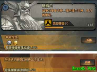 《诸神皇冠》格纳尔神像作用介绍一、格纳尔神像作用一览 1、税收增加 每级神像祭拜加成0.5%%,金币和银币的产量加多。 2、生育男孩 每级神像祭拜加成0.5%%,大幅度提升生男孩的几率。