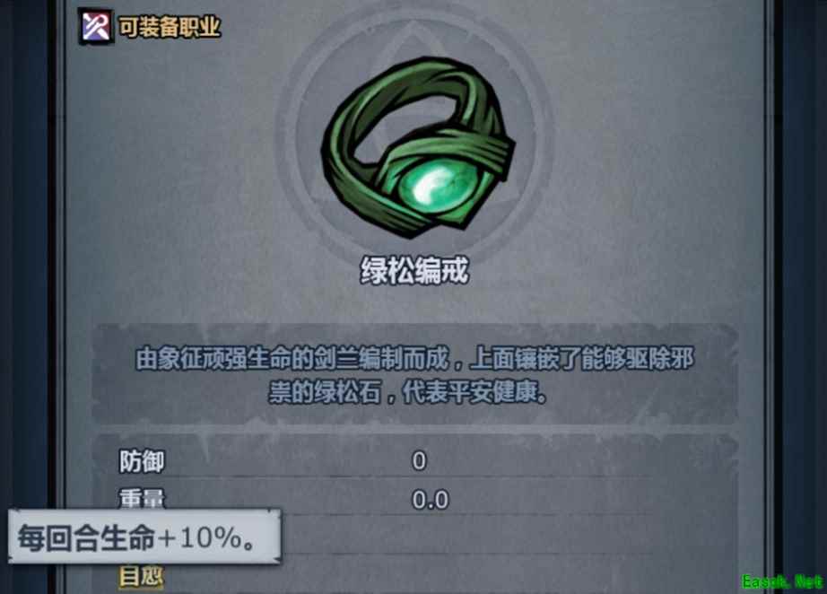 《诸神皇冠》绿松编戒获取方法介绍一、绿松编戒获得途径 1、绿松编戒可以在装备特卖中购买,售价为1000水晶; 2、绿松编戒属于常驻商店的物品,只要水晶够了就可以去买。 二、绿松编戒属性介绍 1、用途:战斗用 2、效果:体质 4 自愈:每回合回复10%生命值 三、绿松编戒强度点评 1、绿松编戒是加体质的饰品,凡是加体质的强度都不会太差; 2、绿松编戒的属性是4体质、14负重、数值并不低; 3、绿松编戒还有自愈小添头,综合实力还是挺不错的。