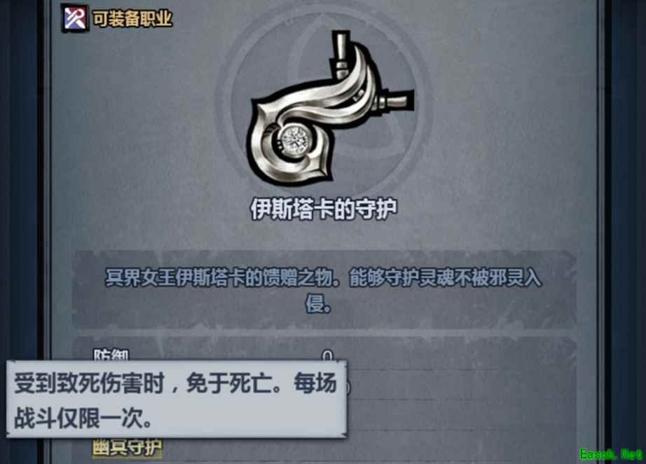 《诸神皇冠》伊斯塔卡的守护获取方法介绍一、伊斯塔卡的守护获得途径 1、伊斯塔卡的守护可以在装备特卖中购买,售价为1000水晶; 2、伊斯塔卡的守护属于常驻商店的物品,只要水晶够了就可以去买。 二、伊斯塔卡的守护属性介绍 1、用途:战斗保命 2、效果:意志 3 3、幽冥守护:当受到致命伤害时强制保留一滴血量 三、伊斯塔卡的守护强度点评 1、伊斯塔卡的守护是万能饰品之一,脆皮福音,不怕突然暴毙; 2、尤其是法师队长特别适合佩戴伊斯塔卡的守护,可以增加操作容错率; 3、NPC使用伊斯塔卡的守护时强制保留0血,经常引起新玩家误解; 4、伊斯塔卡的守护的性价比高,值得购买。