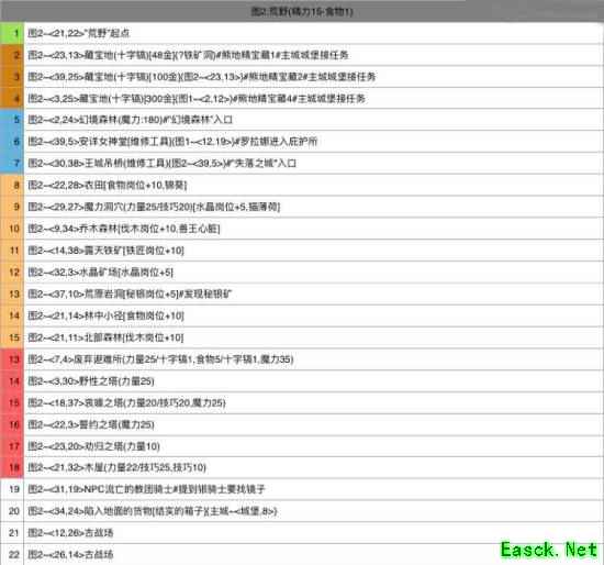 一、记得孤塔女巫要我们找的三件材料,找到农田获得锦葵,找到巡林客,击杀后得到兽王心脏,打穿魔力洞穴可得到猫薄荷。 二、三种素材集齐回一图孤塔给女巫可以调制一种药剂,然后图2右上角的地方召唤怪鸟,也就是荒野的boss。荒野右上角有个圆点,进去泼洒药剂进入剧情,1250血,超级强力,大家还是带透镜好好准备吧。 三、努力扫荡各种资源点,流亡骑士900血,不是很好打,请大家自重。 四、荒野有秘银矿脉,占领后可在庄园生产秘银,十分重要。 ps:荒野中的狼和骑士以及幼龙都很强力,建议玩家至少有两个A级英雄打底来探索,且最好能转职。 任务点坐标