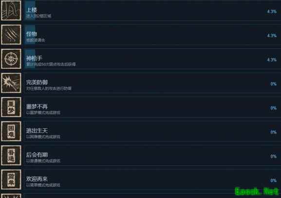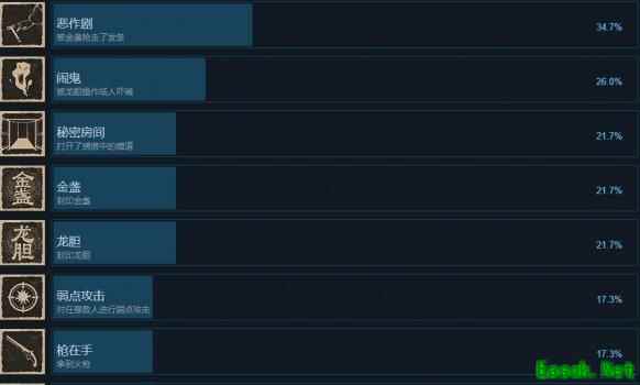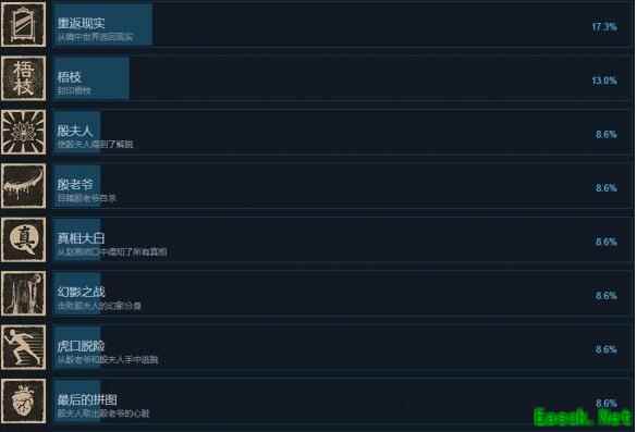 恶作剧 | 被金盏抢走了发条 | 闹鬼 | 被龙胆操作纸人吓唬 | 秘密房间 | 打开了绣房中的暗道 | 金盏 | 封印金盏 | 龙胆 | 封印龙胆 | 弱点攻击 | 对任意敌人进行弱点攻击 | 枪在手 | 拿到火枪 | 殷凌 | 与殷凌展开面对面的战斗 | 无限回廊 | 走出无尽的幻境 | 重返现实 | 从镜中世界逃回现实 | 梧枝 | 封印梧枝 | 殷夫人 | 使殷夫人得到了解脱 | 殷老爷 | 目睹殷老爷自杀 | 真相大白 | 从赵画师口中得知了所有真相 | 幻影之战 | 击败殷夫人的幻影分身 | 虎口脱险 | 从殷老爷和殷夫人手中逃脱 | 最后的拼图 | 殷夫人取出殷老爷的心脏 | 珍珠 | 封印珍珠 | 上楼 | 进入到2楼区域 | 怪物 | 被殷凌袭击 | 神枪手 | 累计完成50次弱点攻击后获得 | 完美防御 | 对任意敌人的攻击进行防御 | 噩梦不再 | 以噩梦模式完成游戏 | 逃出生天 | 以困难模式完成游戏 | 后会有期 | 以普通模式完成游戏 | 欢迎再来 | 以简单模式完成游戏 | 防守反击 | 完美防御之后完成弱点攻击 | 毫发未伤 | 防御50次敌人的攻击后获得 | 走马观花 | 在4小时内完成游戏 | 终焉 | 获得其他所有奖杯 | 弹无虚发 | 击中了所有敌人的弱点 | 梦回童年 | 找到了所有赵丹青日记 | 记录员 | 收集了所有文献记录 | 流言蜚语 | 完整听完了所有陈妈和管家之间的对话 | 万劫不复 | 毁灭了所有亡魂 | 我心向善 | 超度了所有亡魂 | 漫游二层 | 探索过殷府二层内所有的房间,并开启所有门 | 血封咒 | 第一次解开血封咒 | 最高评价 | 获得S级评价 |