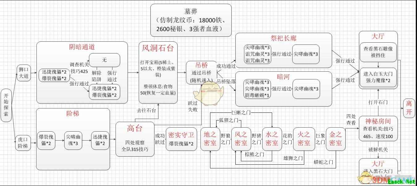 开启方法 1.【市场】买【龙纹银币】5000金币,到图4正右方据点通过即可获得【仿制龙纹硬币蓝图】 2.在工坊制作【仿制龙纹硬币】(铁×18000、秘银×2600、强者血液×3),前往图11的副本入口(45,22)即可消耗一个仿制龙纹硬币进入副本(如果挑战失败,当日可以通过消耗300食物再次进入)。 阵容: 潜行者#夜刃、法师#大法师、圣职#大祭祀、圣职#审判官 装备: 圣职#审判官装备符文师护甲(特效:流血免疫)、净化护符(特效:瘟疫免疫) 进入条件 潜行者或队伍中任意英雄技巧>465,速度>400,其余所有角色技巧>315 流程图