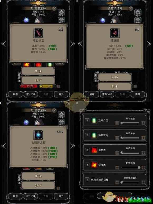 《地下城堡2》图24盗魂者·伊格莫森打法攻略这个盗魂者确实很难缠,打了两天。试了几乎所有能看到的方法,最后还是用龙猎+火法+狂战+祭祀通过的。(用别的方法没能通过,尤其是圣枪,开局很快就死了) 基本上都是各种枪(烈枪,圣枪,龙猎,传猎)进行搭配,就个人感受而言,用后两种貌似更容易一些。因为是攻击技能本身自带吸血,所以战利品就可以不使用单体吸血。 打法上就是火法奶一次攻击三次,然后循环进行。最后几十秒,如果伤害不够的话,可方式奶,刷脸拼输出。 我本身过的很惊险,几乎是在最后时刻过的。所以此次推荐的攻略供大家参考,是否选用看个人选择!