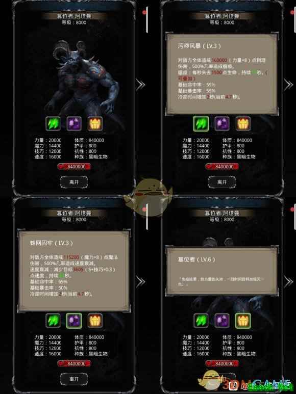 《地下城堡2》图二十四多西亚王城攻略大全 《地下城堡2》图24篡位者·阿塔曼打法攻略这个怪怎么说呢,本身没有什么多大难度,就是费时间。耗时点就在于小怪,一攻击就直接被反死根本就没有进入重伤的机会,所以每次只有等到怪反击消失时手动进行攻击,然后等待下次攻击机会。 (打的策略是先打boss后打小怪)