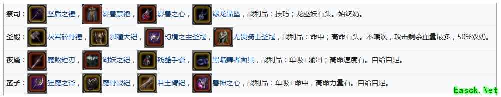 简介: 负重接近10000,双输出不磨叽。 圣殿面板命中90+。打怪鸟以7700速度计算,若有150%命中则吊打之(由于武器特效,计算命中时不计圣冠的技巧增幅)。 蛮子面板命中60+,如果体质太低被沙虫物攻秒,考虑把君王换成绿心/手动圣殿;魔骨甲有效防止沙虫/蜡魔灼烧导致的暴毙。拿到裂狱、英雄头巾则替换原装备。 祭司务必上2000抗防灼烧,站队伍最左边。 以上述配装为基础的略微修改 余意浮沉: 1.祭祀:配装不变。(当然,你可以选择将影兽禁袍换成神谕长袍,前提是你的祭祀拥有的抗性不能保证她大多数时候免疫灼烧) 2.蛮子:魔骨战凯换成怒涛甲,君王之臂换成巨蛇之盾。 3.圣殿:邪瞳大铠换成暗物质服。 4.夜魇:配装不变。(残酷手套可以换成黑锋之戒) 小怪挂机阵容3 来自贴吧——XialAlone 狂战:狂魔 巨兽 兽心 防火芯片 15命暴君 力量+10命 夜魇:煞匕 飓风 面具 虚无假面(高速) 飓风/猎神 高速 祭司:坚盾 咸鱼 影心 绿龙坠 乌鸦 星国 高技 圣殿(日1工具人):灰岩 暗物质 圣冠 海心 10命龙巫妖 魔+13.3命 这一套好的地方在于上场的人都很常见,圣殿只需要日然后命中拉满(我的是61.6+170%异常)就可以。狂战怼力,三人防火,遇到融蜡奶的压力很小。遇到沙虫改重伤,记得开局祭司奶一口,这样两个AOE以后开始重伤循环。其他情况圣殿随意攻击,遇到三个怪手动晕两个,不管是融蜡还是掘地都能硬抗一个,死一个以后开自动。圣殿配装可以调的空间很大,命中和异常拉满就可以,只当个工具人。