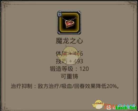 《地下城堡2》魔龙之心属性效果介绍魔龙之心 体质+ 406 技巧+ 493 锻造等级: 120 可重铸 治疗抑制:敌方治疗/吸血/回春效果降低20%。 获取方法:永望之殿击败残守护者后,再次击败图1英灵殿的残破守护者后开启古代残片任务,击败图14消耗型boss无魂魔龙获取