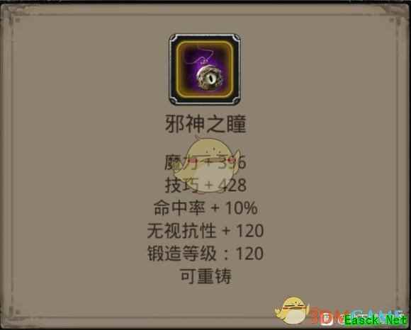 《地下城堡2》邪神之瞳属性效果介绍邪神之瞳 魔力+396 技巧+ 428 命中率+ 10% 无视抗性+ 120 锻造等级: 120 可重铸 获取方法:裂隙60层BOSS魂魄换取