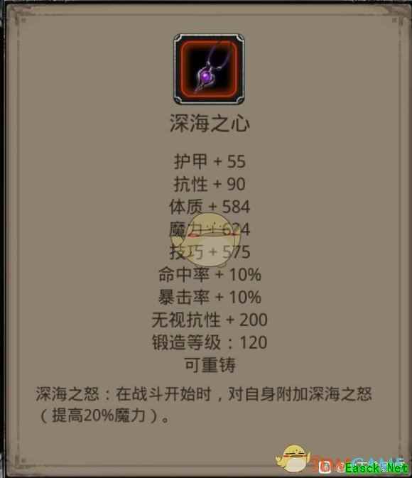 《地下城堡2》深海之心属性效果介绍深海之心 护甲+55 抗性+ 90 体质+ 584 魔力+ 624 技巧+ 575 命中率+ 10% 暴击率+ 10% 无视抗性+ 200 锻造等级: 120 可重铸 深海之怒:在战斗开始时,对自身附加深海之怒(提高20%魔力)。