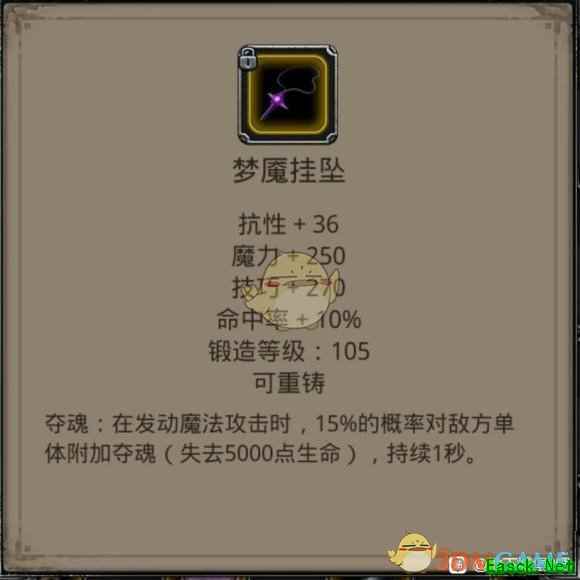 《地下城堡2》梦魇挂坠属性效果介绍梦魇挂坠 抗性+ 36 魔力+ 250 技巧+ 270 命中率+ 10% 锻造等级: 105 可重铸 夺魂:在发动魔法攻击时,15%的概率对敌方单体附加夺魂(失去5000点生命) , 持续1秒。
