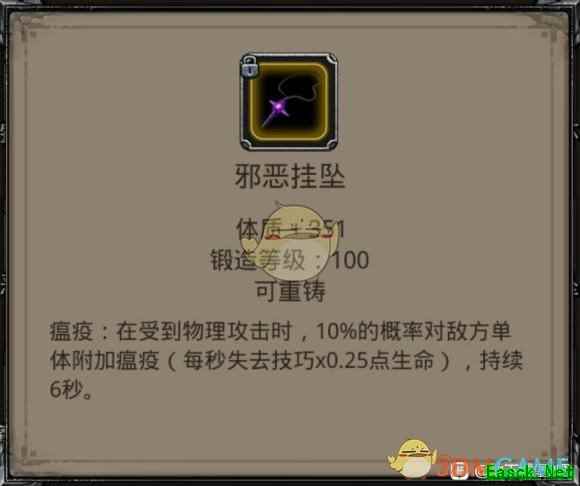 《地下城堡2》邪恶挂坠属性效果介绍邪恶挂坠 体质+351 锻造等级: 100 可重铸 瘟疫:在受到物理攻击时,10%的概率对敌方单体附加瘟疫(每秒失去技巧x0.25点生命),持续6秒。