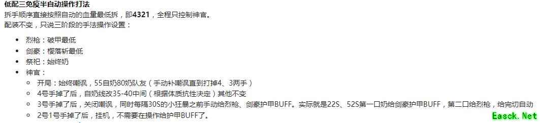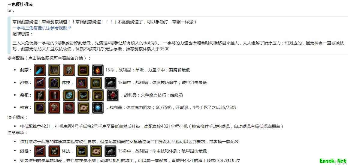 《地下城堡2:黑暗觉醒》伊兹玛尔打法攻略免疫挂机法 配装思路: 三人火免使得一字马的3号手威胁降到最低,先清理4号手让所有烦人的dot消失,一字马的力速也会随着时间推移越来越大,大大缓解了治疗压力;相对应的,因为神官一直被减技巧,剑豪无法防火并且双抗较低,体质不够高几乎无法存活,推荐剑豪体质大于3500