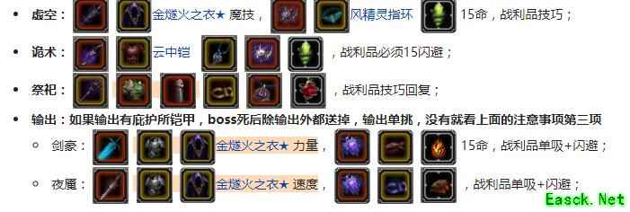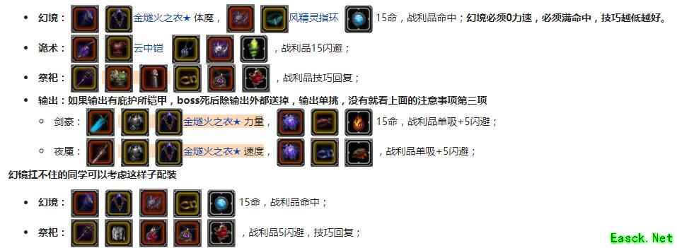 打法设置A: 剑豪:鹰落斩最高血/夜魇:连击最高 祭祀:始终奶 诡术:设置总血量最高,开诡雾弹 幻境:三人群,开吸血,开局挂机,等待boss攻击后再出手,出手后挂机即可 诡术第一次攻击boss,后攻击左侧小怪,然后循环,必须注意好节奏(通常诡术cd较短,时间一长会被幻境提前覆盖减技,务必保证幻境攻击之后,诡术再减boss技巧)。 打法设置B:(幻境全程自动) 剑豪:鹰落斩最高血/夜魇:连击最高 祭祀:始终奶 诡术:只开诡雾弹,总血量最高 幻境:炫光术设置三人以上,生命虹吸 开局剑豪祭祀幻境诡术均自动,诡术第一次自动攻击后切换并保持手动。当幻境读条完毕自动攻击后,立刻手动诡术(诡雾弹)攻击左边小怪。下一次幻境攻击后,立刻手动诡术攻击Boss。如此循环,每次手动诡术都跟在幻境攻击后。Boss死后全部挂机。 虚空诡术打法,赌开局魔攻By:石头 参考配装
