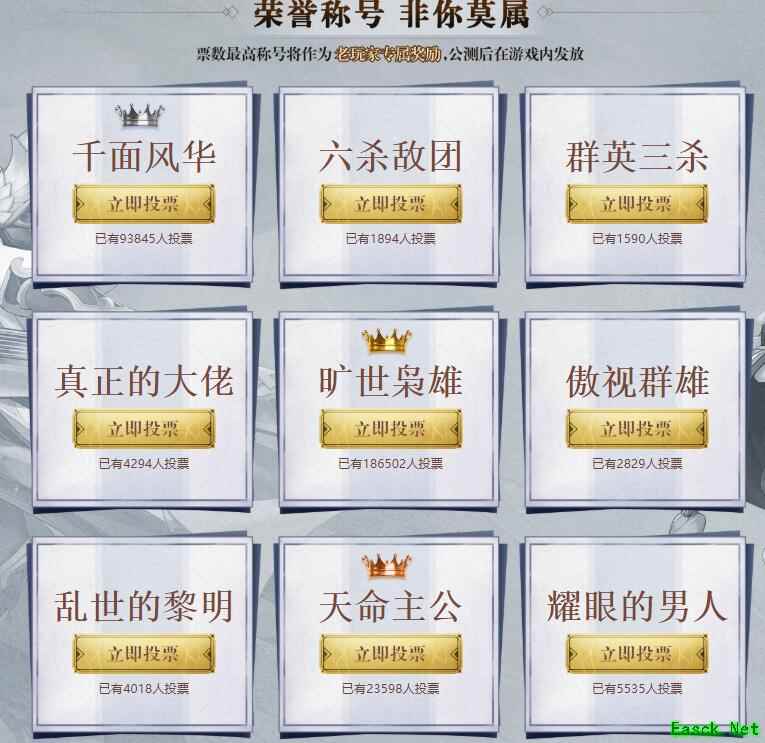 《放开那三国3》老玩家绝版称号获得方法老玩家绝版称号获得位置:http://sg3.zuiyouxi.com/act/old_reservation/index.html 获得方法: 1、为喜欢的称号投票,活动期间每人每天可投1次。 2、活动结束后,获得投票数最多的称号,在游戏公测后,可获得此荣誉称号。 可以获得的称号如下图: