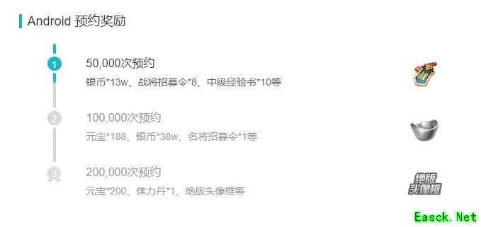 预约人数5万奖励: 战将招募令*8、银币*13万、中级经验书10等 预约人数10万奖励: 元宝*188、银币*38万、名将招募令*1等 预约人数20万奖励: 元宝*200、体力丹*1、绝版头像框等 以上就是小编整理带来的《放开那三国3》taptap安卓预约礼包获取方法介绍,更多精彩内容,请点击关注易采游戏网,小编将持续为您更新! 本文内容来源于互联网,如有侵权请联系删除。 |