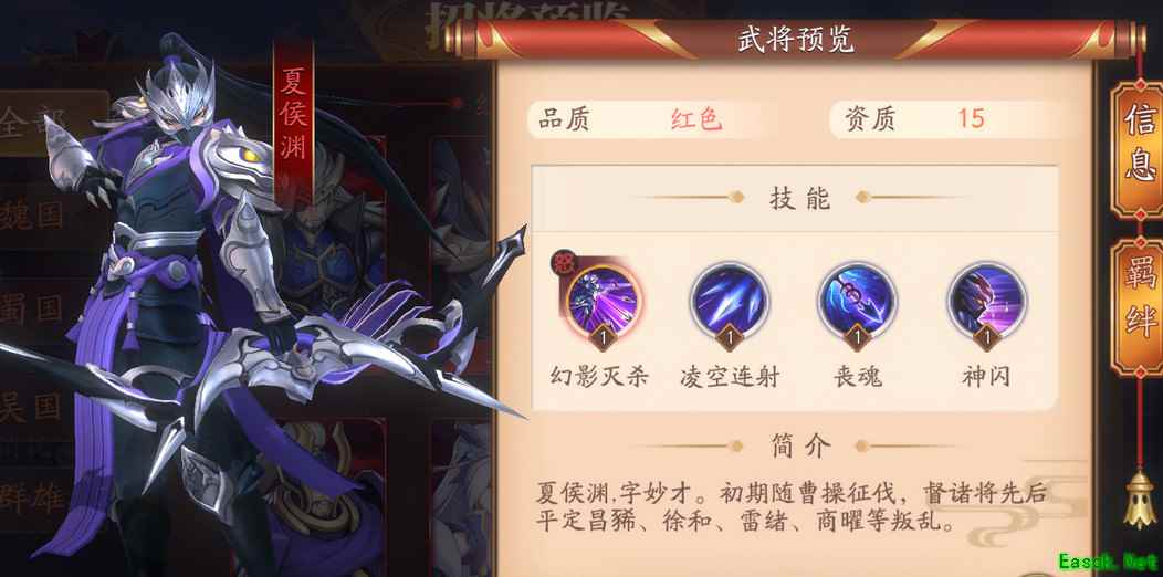 《放开那三国3》夏侯渊强度评测一、人物如何获得 夏侯渊可以从酒馆抽取获得。 二、人物简介 武将:夏侯渊。 国家:魏。 品质:红。 资质:15。