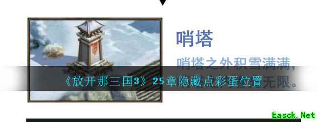 《放开那三国3》拥有多维度策略战斗机制,开放自由的卡牌养成系统,丰富多元的玩法体验,为了能让少主自由选择自己心仪的奖励,还特意推出了副本彩蛋专栏!《放开那三国3》第25章隐藏点彩蛋在哪?下面一起看看小编给大家带来的《放开那三国3》25章隐藏点彩蛋位置介绍! >>>>小编推荐:武将图鉴汇总 | 礼包兑换码大全 | 副本彩蛋汇总 | 藏宝图位置大全 | 隐藏点地图位置大全